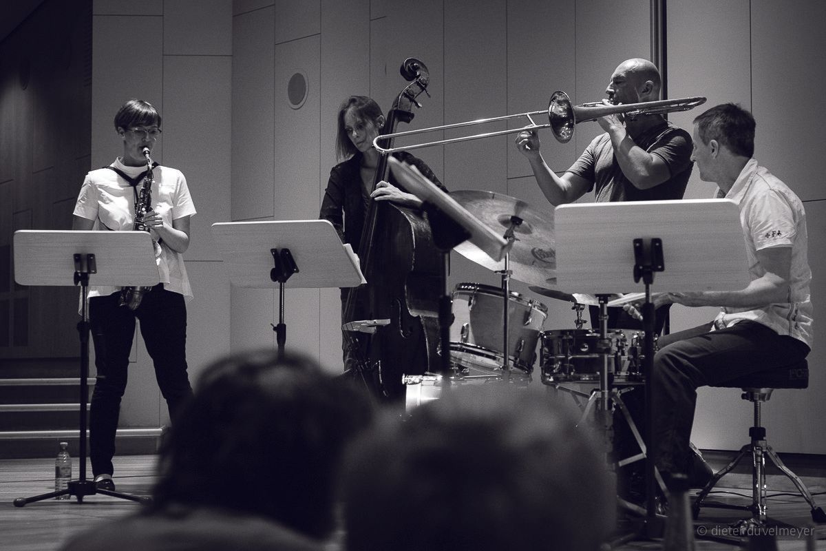 Ternion Quartet is fronted by two amazing artists, alto saxophonist Silke Eberhard (rising star, DownBeat Magazine 2015 & 2017), and trombonist Geoffroy De Masure (professor at The Jazz Institute of Berlin), and is brilliantly supported, buoyed and propelled by Ms. Iversen and long-time friend and colleague from NYC, German-born drummer Roland Schneider. Iversen composes to allow the musicians unlimited space for their creative input, which is imperative to having a true dialogue. “The compositions I bring to the band are open pages. I do not dictate how anyone should play. The composition comes alive when each musician contributes what he or she hears and feels. The composition is an opening statement, setting the topic for the discussion, and the dialogue is the means for us to get the most out of each and every experience. We can be very different people, and we are, but because we share the values of keeping an open mind, being curious, respectful, and humble, the interactive dialogue we have with each other moves us and the music forward and the composition comes alive!”, said Iversen.
